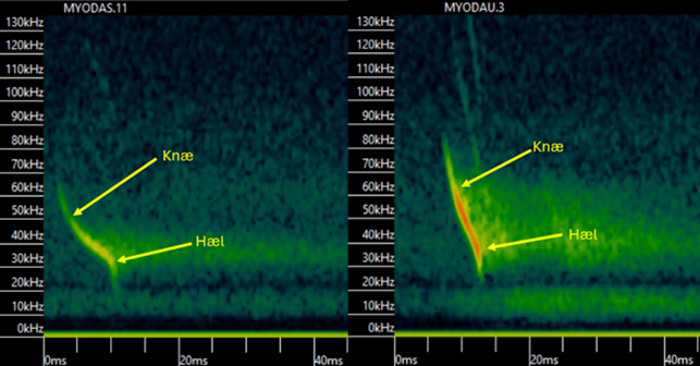 Eksempler på et kald med overlappende karakteristika mellem Damflagermus (Myotis dasycneme) og Vandflagermus (Myotisdaubentonii) (Til venstre) og et kald, der med sikkerhed kan tilskrives til Vandflagermus (Til højre)